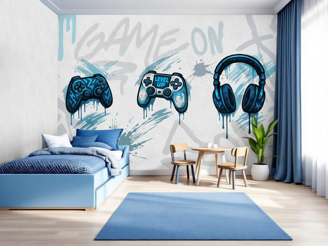 детские, синие, белые, голубые, джойстики, наушники, надписи, игры, абстракция