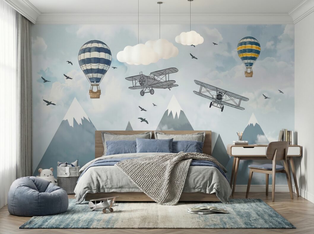 детские, синие, белые, голубые, самолетик, воздушный шар, птицы, горы, облака